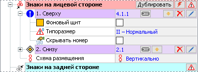 Добавить знак на лицевую сторону. В выпадающем списке выберите нужный знак — он добавляется на установку. Если порядок знаков не соответствует предписанному по ГОСТ Р 52289–2019, то строка Знаки на лицевой стороне подсвечивается красным. В таком случае можно нажать появившуюся кнопку  Исправить порядок размещения знаков, чтобы знаки на установке автоматически упорядочились по ГОСТ. Аналогично можно добавить знаки и упорядочить их и для обратного направления.