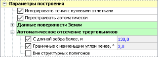 Часть граничных треугольников триангуляции, как правило, является «лишней»: такие треугольники можно определить по критерию длины ребра и наименьшего угла. Функции автоматического отсечения треугольников расположены в свойствах триангуляции в инспекторе объектов в разделе Параметры построения. Чтобы автоматически отсечь треугольники с очень длинными рёбрами, установите опцию С длиной ребра более и укажите предельную длину ребра. Также можно отсечь Граничные треугольники с наименьшим углом менее, чем заданный. Кроме того, при необходимости можно включить настройку отсечения Вне структурных полигонов: она позволяет отсечь всю поверхность за пределами структурных полигонов слоя.