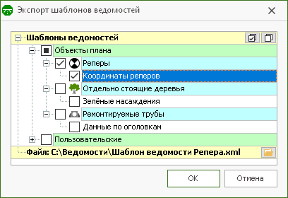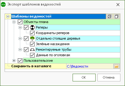 Экспорт шаблонов в разделе Шаблоны. В диалоговом окне экспорта отображаются пользовательские шаблоны ведомостей, сгруппированные по разделам и объектам. Выберите шаблоны, которые необходимо экспортировать. Чтобы выбрать все шаблоны, нажмите кнопку