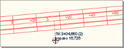 . Курсор на плане примет вид прицела с перпендикуляром к трассе, рядом с которым отображается текущее пикетажное положение. Щёлкните мышью в точке с нужным пикетажным положением.