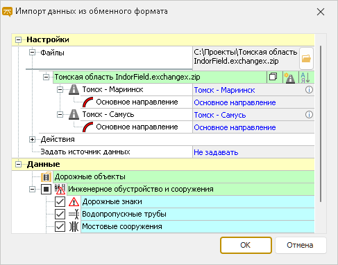 В разделе Настройки укажите путь к файлу обменного формата. После выбора файла отображается его название и список прочитанных дорог.
