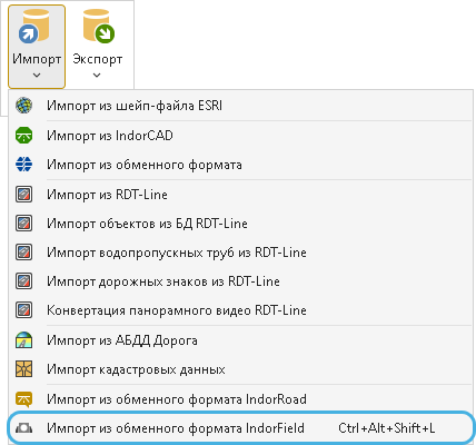 Для того чтобы импортировать файл обменного формата перейдите на вкладку Данные > Импорт и выберите пункт Импорт из обменного формата IndorField.