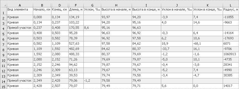 Предположим, что информация об элементах продольного профиля дороги имеется и представлена в виде файла Microsoft Excel. Импортируем данные из этого файла в базу данных.