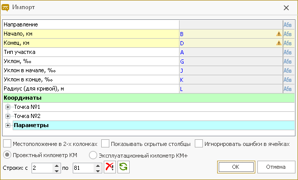 Импорт и в диалоговом окне открытия файла выберите нужный файл — папка IndorRoadData > файл Элементы продольного профиля.xls. -