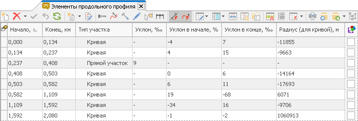 Обратите внимание, для каждого участка в таблице указаны три вида уклонов: уклон, уклон в начале, уклон в конце. При подъёме дороги на прямом участке значение уклона будет с положительным знаком «+». При спуске дороги на прямом участке — значение уклона с отрицательным знаком «–». В случае вертикальных кривых значение уклона разделяется на два параметра: уклон в начале и в конце участка.