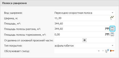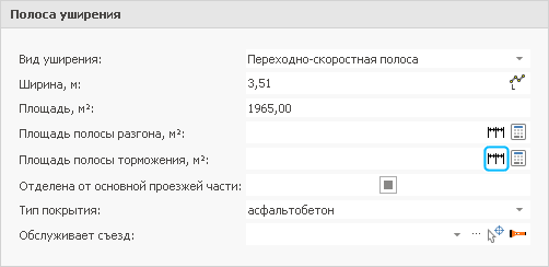 После этого в карточке полосы уширения в поле Площадь полосы торможения отобразится рассчитанное по карте значение.