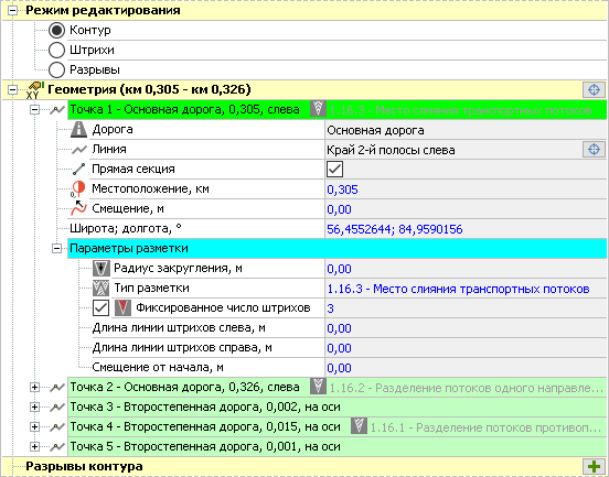 Для редактирования разметки типа 1.16 предусмотрено три режима: редактирование контура разметки, штрихов и разрывов. Включить тот или иной режим можно в свойствах разметки в разделе Режим редактирования. На схеме при этом доступны либо управляющие точки для редактирования контура разметки, либо управляющие точки для изменения направления штрихов, либо границы разрывов.