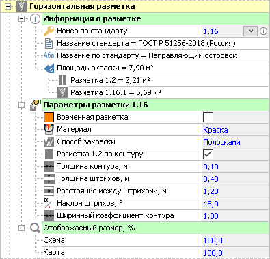 В полях Толщина контура, Толщина штрихов, Расстояние между штрихами и Наклон штрихов настраиваются соответствующие параметры отрисовки разметки 1.16.