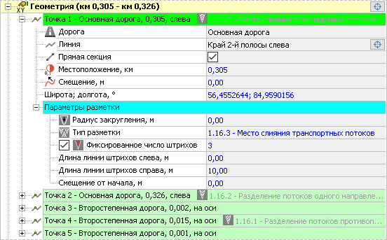 Точное положение разметки можно задать в инспекторе объектов в разделе Геометрия. Здесь же отображается линия привязки разметки и дорога, к которой разметка привязана. Чтобы изменить линию привязки любой точки разметки, нажмите кнопку