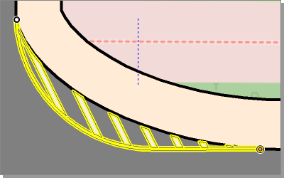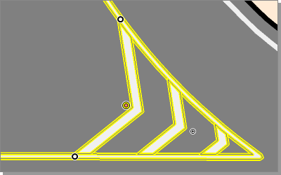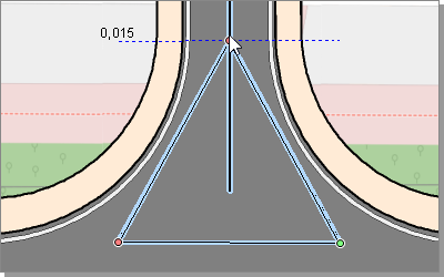 Если линейно-протяжённая разметка частично переходит с одной линии привязки на другую линию (например, обозначается край проезжей части при наличии автобусного кармана или полосы уширения), то в процессе создания нужно указать дополнительные точки, фиксирующие переход разметки с одной линии привязки на другую.