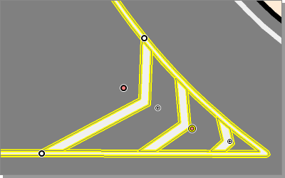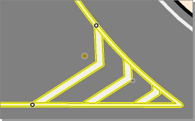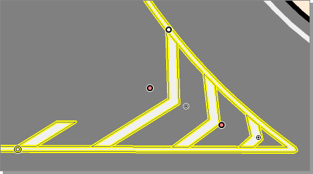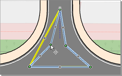 Управляющие точки линейно-протяжённой разметки позволяют редактировать её контур. При необходимости можно удалять существующие узловые точки и добавлять новые. Более подробно работа с узловыми точками описана в разделе Дорожные знаки в пункте Выноска и подпись местоположения.