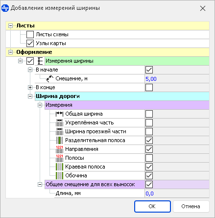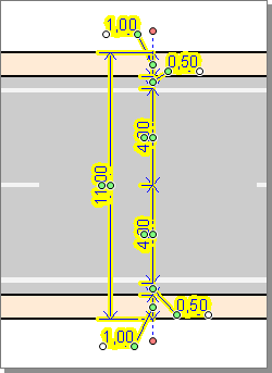 Для обозначения ширины различных элементов дороги (полос движения, разделительных полос и пр.) включите режим Оформление > Элементы оформления >