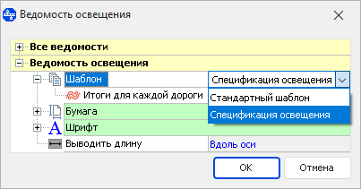 При формировании ведомостей из раздела Данные > Чертежи и ведомости > Спецификации и ведомости выберите шаблон в окне настроек в поле Шаблон. Далее потребуется указать необходимые параметры и подтвердить формирование ведомости.