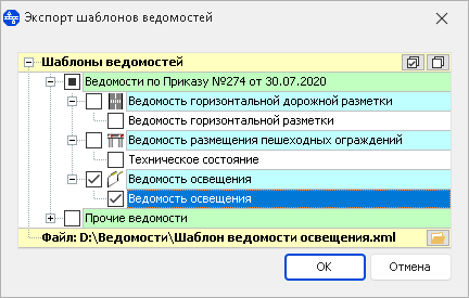 Чтобы сохранить созданные шаблоны ведомостей, нажмите кнопку Экспорт шаблонов в разделе Шаблоны. В диалоговом окне экспорта отображаются пользовательские шаблоны ведомостей, сгруппированные по разделам и объектам. Выберите шаблоны, которые необходимо экспортировать. Чтобы выбрать все шаблоны, нажмите кнопку