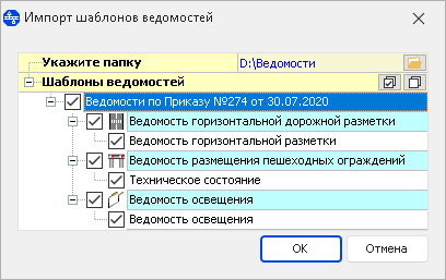 Чтобы импортировать сохранённые ранее шаблоны, нажмите кнопку Импорт шаблонов. В открывшемся окне выберите папку с шаблонами ведомостей. Галочками отметьте, какие шаблоны необходимо импортировать.