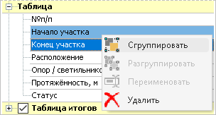В редакторе шаблонов есть возможность сгруппировать и разгруппировать столбцы. Чтобы сгруппировать столбцы, в разделе Таблица выделите несколько элементов списка, удерживая нажатой клавишу Ctrl, и нажмите кнопку