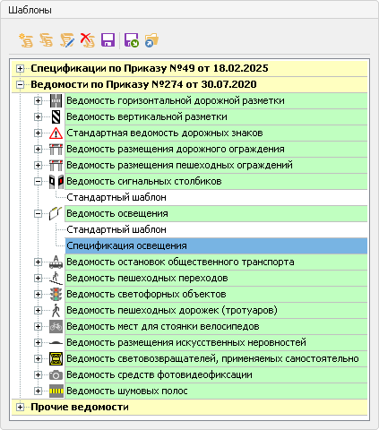 Шаблоны. В этой части окна перечислены шаблоны ведомостей в разделах Спецификации по Приказу №49 от 18.02.2025, Ведомости по Приказу №274 от 30.07.2020 и Прочие ведомости. Для каждого типа объектов можно создавать собственные шаблоны. Для объектов предусмотрен стандартный шаблон, представляющий собой ведомость, формируемую в системе по умолчанию.