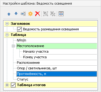Свойства объекта. При выборе шаблона в этой части отображаются свойства объекта, которые можно добавить в шаблон ведомости.