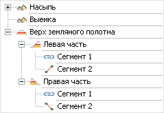 Верх земляного полотна. Он состоит из двух частей (групп): левой и правой, в составе которых автоматически создаётся по одному сегменту.