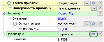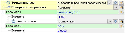 Для настройки позиционирования всех сегментов доступны те же параметры, что определяют положение сегментов проектной поверхности: точка и поверхность привязки, уклон, заложение, dZ и пр. Подробности о них см. в разделе Настройка позиционирования сегментов.