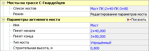 Мосты и путепроводы и щёлкните мышью на мосте. В инспекторе объектов будут отображены параметры выделенного моста. Кроме этого, в поле Список мостов можно выбрать для редактирования другой мост активной трассы.
