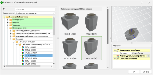 В левой части окна представлен список 3D-моделей. Элементы в нём разделены по тематическим группам: в отдельные папки собраны кабельные колодцы, элементы железобетонных колодцев и пр.