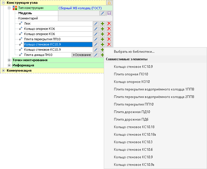 Чтобы создать в узле железобетонный колодец, выберите в поле Тип конструкции вариант Сборный ЖБ-колодец (ГОСТ). Такие конструкции могут состоять из опорных и стеновых колец, опорных плит, плит перекрытия, плиты днища, люка. В свойствах отдельного узла можно добавлять и удалять элементы колодца, а также заменять элементы другими. Для этого предусмотрены соответствующие кнопки в строке элемента: