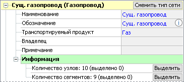 Чтобы выделить все узлы сети, в свойствах сети в строке Количество узлов нажмите кнопку Выделить. Аналогично можно выделить и все сегменты сети, используя кнопку Выделить в строке Количество сегментов. Свойства выделенных узлов или сегментов отображаются в инспекторе объектов.