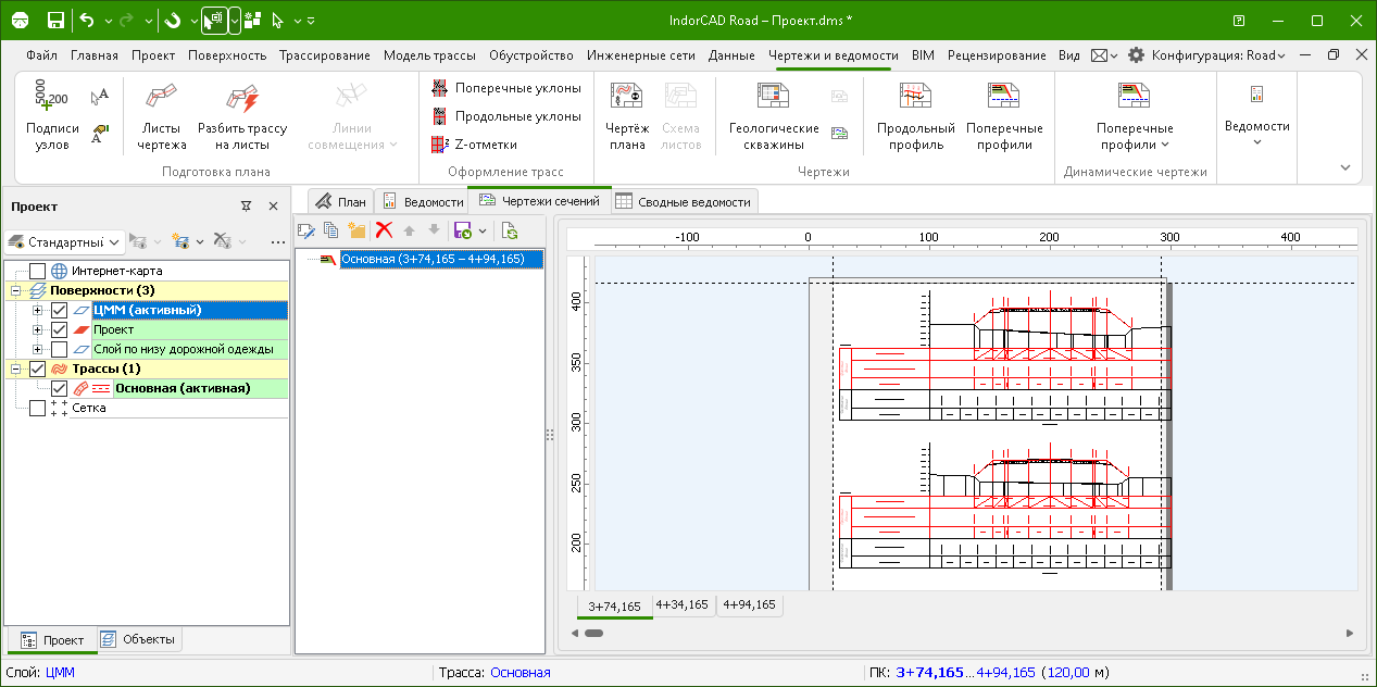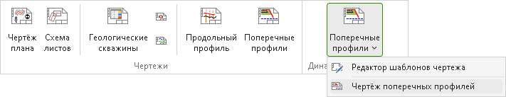 Чтобы сформировать чертёж поперечных профилей по активной трассе, который затем можно сохранить в составе проекта, перейдите на вкладку Чертежи и ведомости > Динамические чертежи > Поперечные профили >
