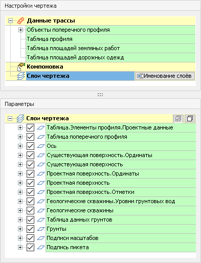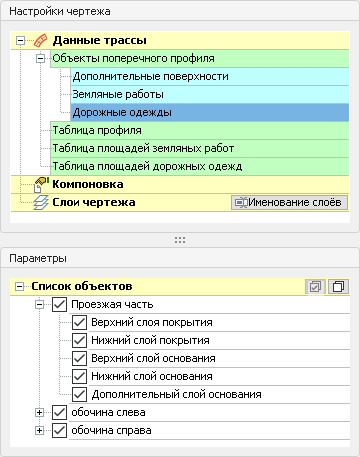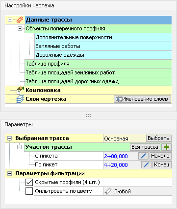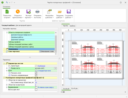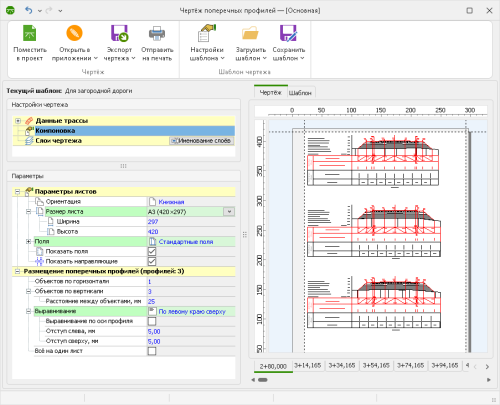 При формировании чертежа настраиваются параметры листа чертежа и компоновки поперечных профилей на листе, а также данные конкретной трассы, по которой формируется чертёж: например, диапазон поперечных профилей, отображение дополнительных поверхностей и пр. Они настраиваются в левой части окна.