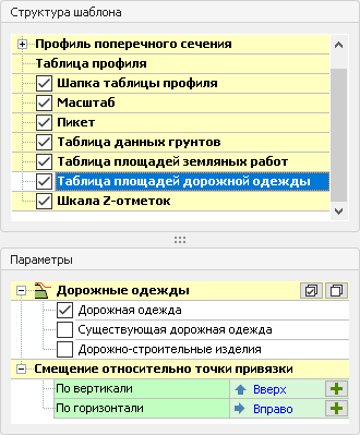 Для отображения таблиц с данными площадей дорожных одежд и земляных работ в структуре шаблона предназначены отдельные блоки: Таблица площадей дорожных одежд и Таблица площадей земляных работ. Включите блок в структуре шаблона, в параметрах настройте типы объектов, площади которых должны отображаться на чертеже. При необходимости переместите блоки в рабочей области шаблона.
