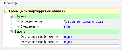 Граница экспортируемой области. Здесь настраивается ширина области поперечного профиля, которая должна попадать на чертёж (например, по границам полос отвода или по крайним точкам проектной поверхности).