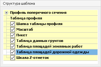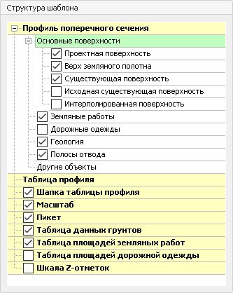Шаблон чертежа поперечного профиля состоит из тематических блоков, таких как профиль поперечного сечения, таблица профиля, масштаб и пр. Тематические блоки в структуре шаблона располагаются на жёлтом уровне. Чтобы блок отображался на чертеже, включите его в структуре шаблона.