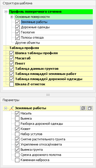 Чтобы при отрисовке чертежа по шаблону на чертеже отобразились земляные работы, в структуре шаблона в разделе Профиль поперечного сечения включите объект Земляные работы. В параметрах объекта включите отображение необходимых видов земляных работ.