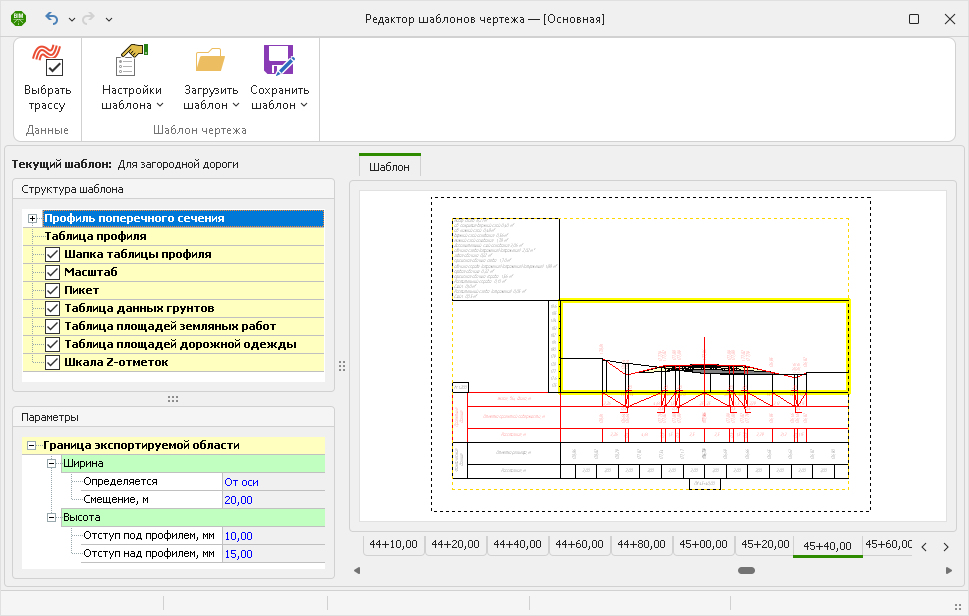 В правой части окна, на вкладке Шаблон, в режиме предпросмотра отображается чертёж поперечных профилей: он формируется по данным выбранной трассы и заданным параметрам шаблона. Для перемещения по трассе используются закладки поперечных профилей, которые отображаются в нижней части области просмотра.