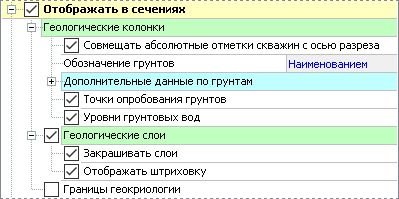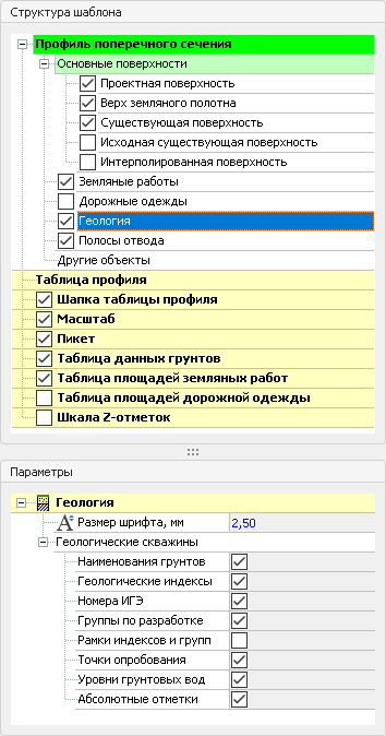 Чтобы включить в шаблоне отображение геологических разрезов и скважин, попадающих в поперечное сечение, в структуре шаблона включите объект Геология в блоке Профиль поперечного сечения. В параметрах настройте видимость тех данных о скважинах, которые должны быть на чертеже.