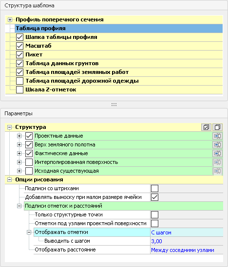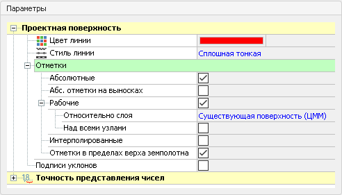 В параметрах шаблона настраивается отображение следующих типов поверхностей: проектной, верха земляного полотна, существующей, существующей исходной (не модифицированной объектами земляных работ), интерполированной. Выделите поверхность в структуре шаблона, чтобы настроить параметры её отображения. Для каждой линии можно задать свой цвет и стиль отображения. Для всех линий можно отобразить рабочие и абсолютные отметки, а для проектной поверхности также интерполированные отметки и подписи уклонов.