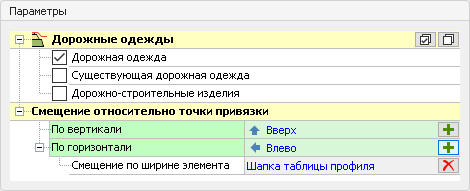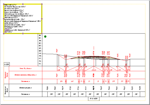 Например, привяжем нижний левый угол таблицы площадей дорожной одежды к верхнему левому верхнему углу профиля поперечного сечения, после чего зададим смещение. Параметры таблицы площадей дорожной одежды, представленные на рисунке ниже, позволяют разместить её с выравниванием по шапке таблицы профиля над чертежом поперечных профилей.