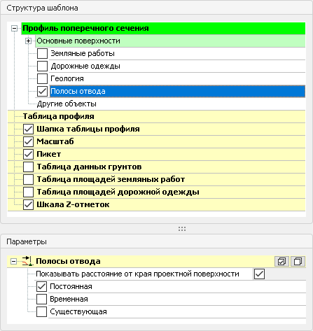 Чтобы добавить в шаблон отображение границ полос отвода, в структуре шаблона включите раздел Профиль поперечного сечения > Полосы отвода. В параметрах дополнительно отметьте типы полос отвода: Постоянная, Временная, Существующая.