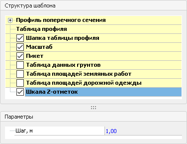 Чтобы на чертеже отображалась шкала Z-отметок, в структуре шаблона включите блок Шкала Z-отметок. Положение этого блока зафиксировано, он всегда располагается слева от профиля поперечного сечения. В поле Шаг в параметрах можно изменить шаг шкалы.