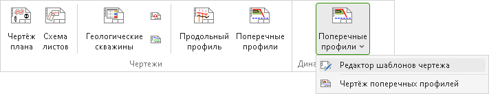 Редактор шаблонов чертежей позволяет настраивать вид формируемых чертежей поперечных профилей. Шаблоном определяется основное содержимое чертежа: наличие определённых тематических блоков и их взаимное расположение, общие настройки оформления. Использование шаблонов позволяет сохранить в проекте динамический чертёж, который автоматически обновляется при внесении изменений в модель автомобильной дороги.