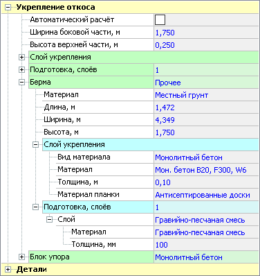 В группе Основная область для основной части укрепления можно указать материал и толщину укреплённого слоя, количество слоёв подготовки, их материал и толщину.