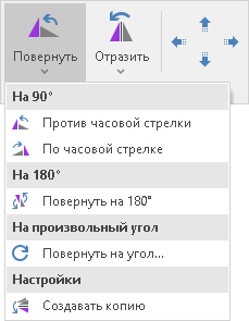 Выделенную фигуру (или несколько фигур) можно повернуть на 90° против часовой стрелки, на 90° по часовой стрелке, на 180° или на заданный произвольный угол.