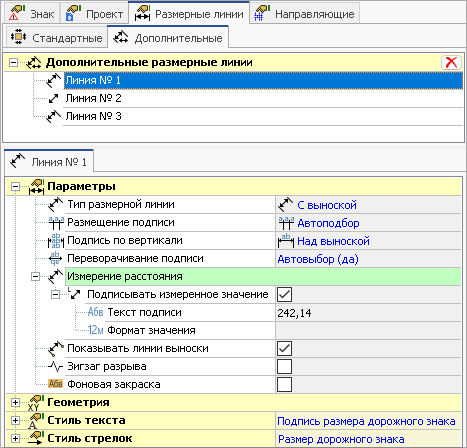 Размерные линии. Эта вкладка предназначена для настройки размерных линий. На ней расположены две вложенные вкладки: Стандартные и Дополнительные. На вкладке Стандартные можно настроить отображение стандартных размерных линий текущего дорожного знака, а на вкладке Дополнительные можно настроить параметры дополнительных размерных линий, созданных пользователем.