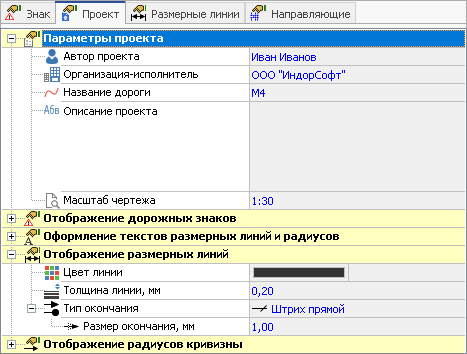 Проект. На этой вкладке отображается общая информация о проекте (автор, организация-исполнитель, масштаб чертежа, палитра отображения дорожных знаков и др.) и параметры оформления создаваемых размерных линий и подписей.