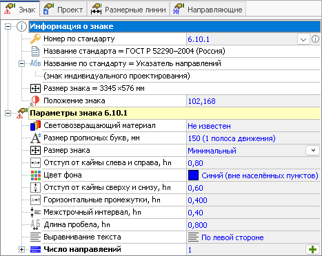 Параметры дорожного знака, составляющих его объектов, размерных линий и направляющих настраиваются в инспекторе объектов. Параметры определённым образом структурированы и разбиты на разделы.