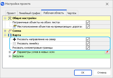На листах карты можно отображать розу ветров, линейку и километровые границы. Они включаются в настройках проекта на вкладке Рабочая область в разделе Карта.